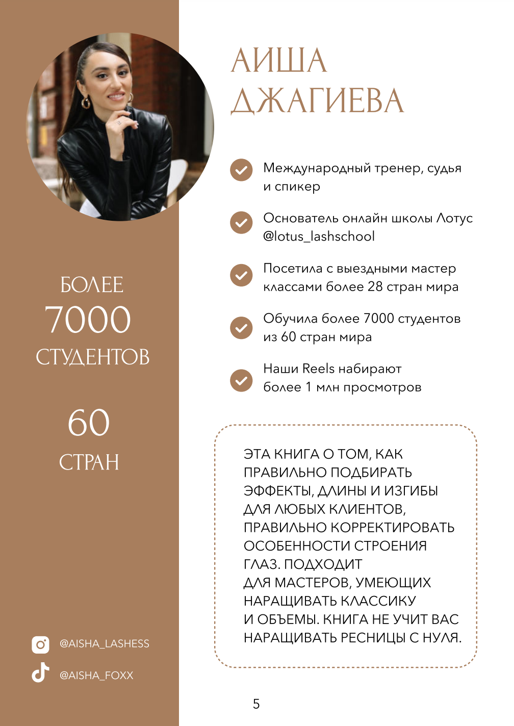 – 10 лет опыта в индустрии наращивании ресниц – Международный топ-мастер и аккредитованный тренер международной ассоциацией LASHINC – Создатель популярных техник в индустрии ресниц по работе с L/M изгибами и лисьим эффектом – Основатель студии по наращиванию ресниц – Основатель международной школы наращивания ресниц "Lotus" с более чем 10.000 студентами из 60 стран – Инстаграм блогер с более чем 320.000 подписчиками (@aisha_lashess)